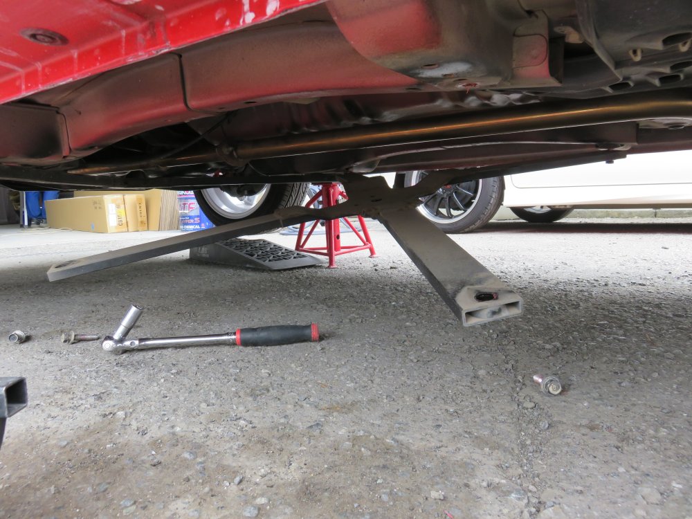 D-SPORT の取付説明書に従い、ジャッキアップしてリジッドラックに載せ作業します。