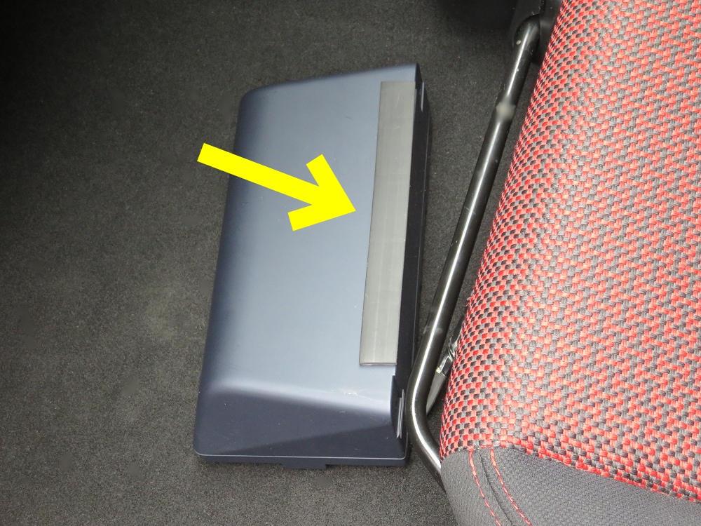 ここに貼ってゴム板がシート調整バーの後ろに来るようにするとゴム板がストッパーになってサブウーファーが前にずれて来るのを防止。